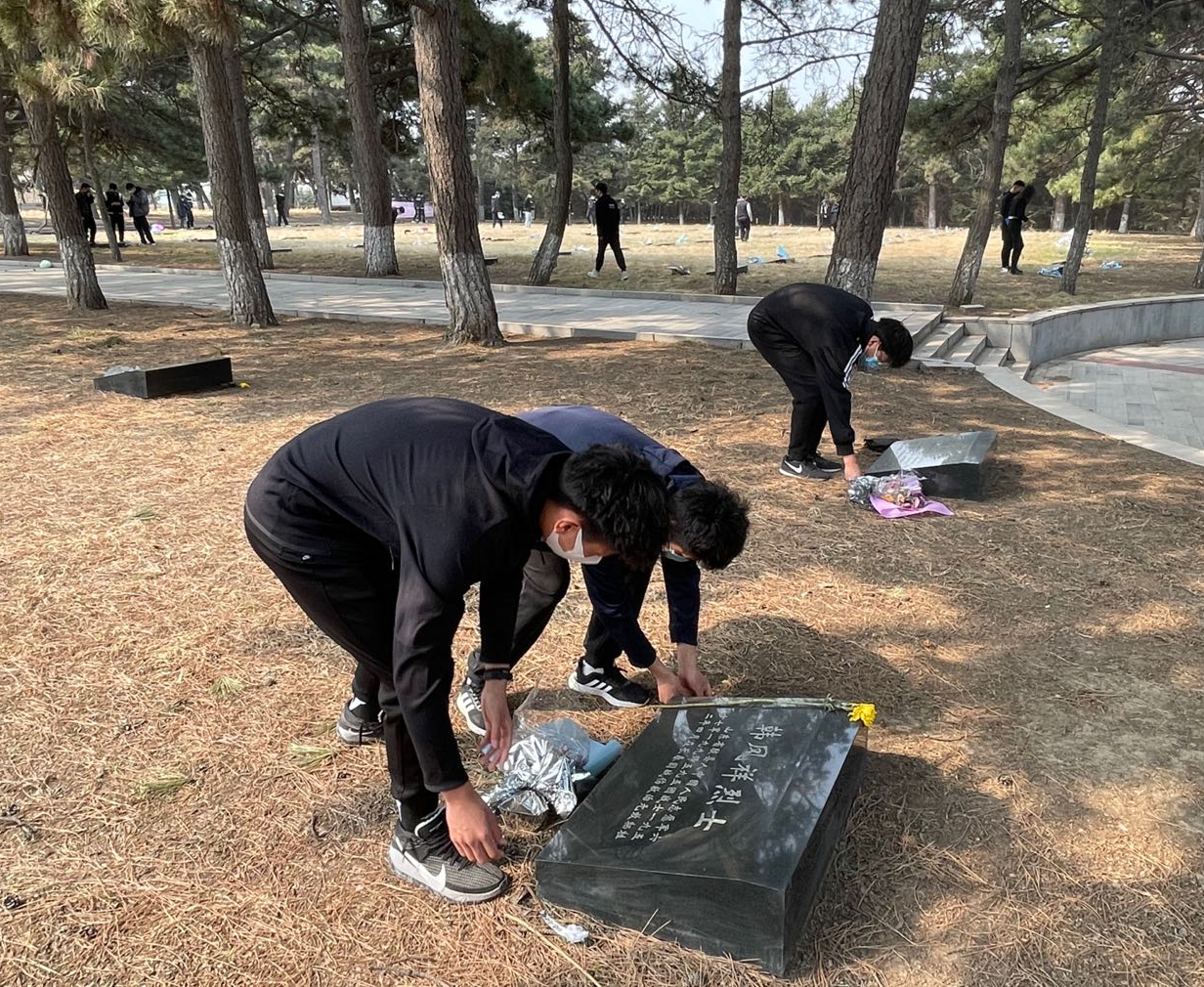 到达烈士陵园后,按照活动安排,首先前往革命烈士纪念碑,由宫勖能老师组织全体师生瞻仰革命烈士纪念碑并默哀,以寄托对先烈的哀思。接着,由员工代表曲心宇为革命烈士纪念碑敬献鲜花。随后,员工代表王奇发言,表达员工们对革命先烈的崇仰之情。最后,进行宣誓仪式,由宫勖能老师带领师生们在纪念碑前郑重宣誓。接着,前往陵园墓地,师生们为烈士墓碑敬献胸花。随后,全体师生前往烈士纪念馆进行参观,看到战争时期的照片、文稿和文物,仿佛置身于革命年代的峥嵘岁月,再现了革命烈士可歌可泣的英勇事迹和催人奋进的牺牲精神。